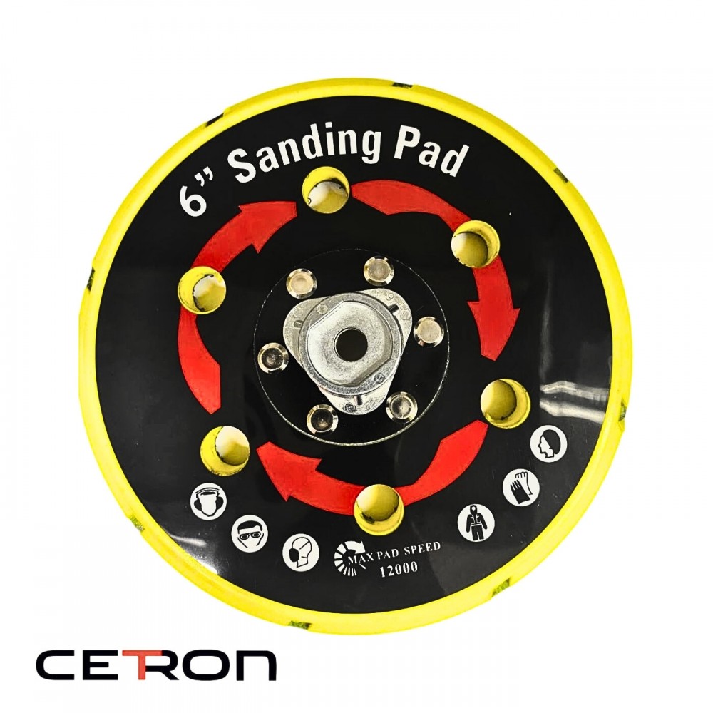 Cetron ML-D-611 — опорная тарелка (диск-подошва) увеличенного диаметра 150 мм, предназначенная для работы с электрическими и пневматическими орбитальными шлифовальными машинами. Модель оснащена классической системой пылеудаления из 15 отверстий, которая гарантирует эффективный отвод пыли из зоны обработки, значительно продлевая ресурс абразивных материалов. Благодаря сбалансированной конструкции и качественному демпфирующему слою, подошва обеспечивает стабильный ход инструмента и высокое качество поверхности при шлифовании больших плоскостей.
