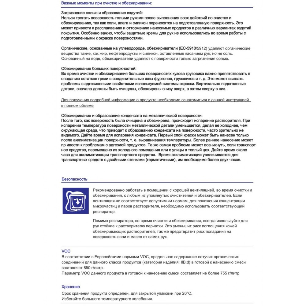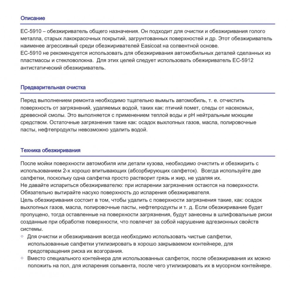 Easicoat EC-5910 — обезжириватель общего назначения на сольвентной основе для очистки голого металла, старых лакокрасочных покрытий и загрунтованных поверхностей. Является наименее агрессивным составом в линейке Easicoat. Предназначен для удаления органических загрязнений, таких как жиры, масла, нефтепродукты и силикон, которые невозможно очистить водой. Тщательное обезжиривание перед шлифованием предотвращает забивание грязи в риски и гарантирует высокую адгезию всей системы.